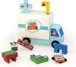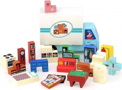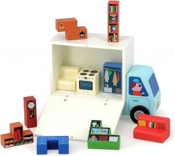 Das Set enthält einen Holz-Umzugswagen und 19 Möbelbausteine, ideal für eigenständiges oder gemeinsames Spielen mit der Familie.
