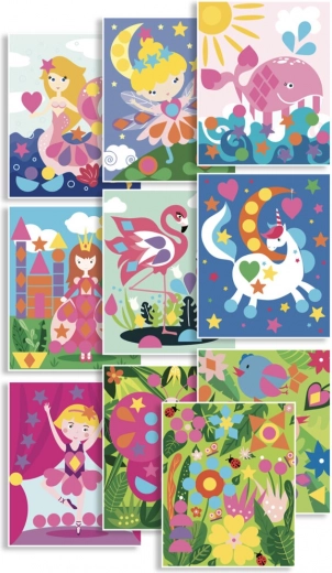 Das Set besteht aus 10 vorgedruckten Bildern (21 × 17 cm) und 5 Stickerbögen mit Motiven wie Fee, Prinzessin, Pony, Einhorn und mehr. Eine praktische Hülle dient auch als Aufbewahrungsort für weiteres Gestalten.