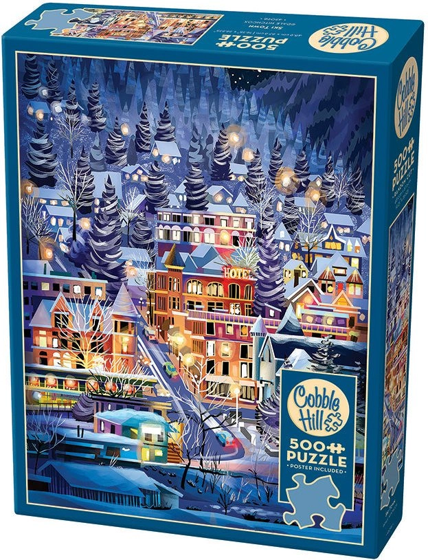 Puzzle COBBLE HILL Skifahrerstadt bietet eine Herausforderung für echte Enthusiasten. Dank des einfallsreichen Designs der Teile, die nicht dem Standardraster folgen, können Sie einzigartiges Puzzeln genießen.