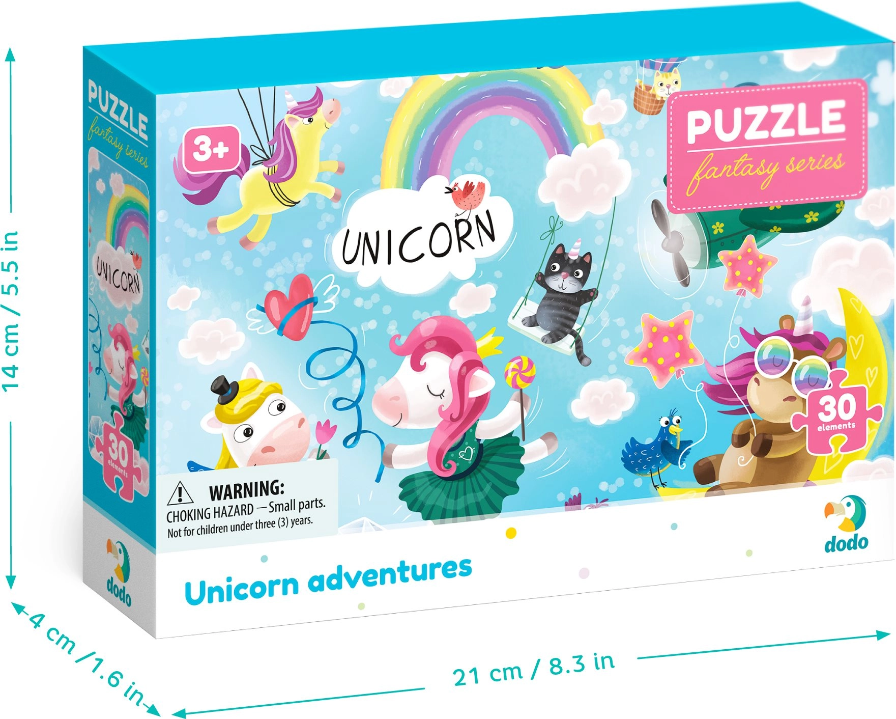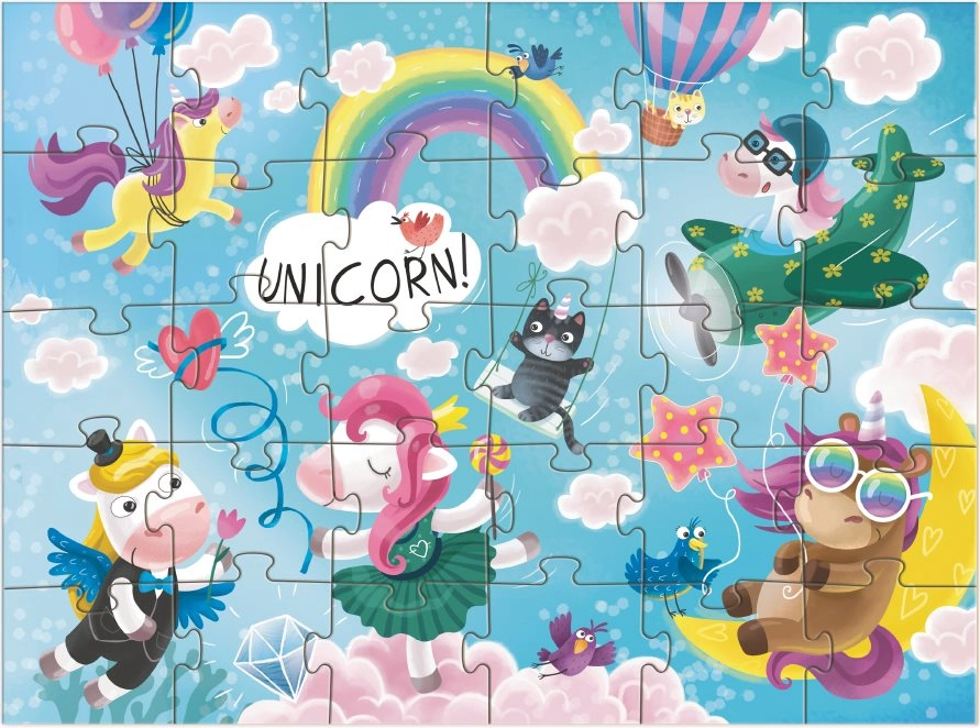 Genießen Sie das Zusammensetzen eines Puzzles mit magischen Einhörnern und begeben Sie sich auf ein Abenteuer voller Fantasie. Das Set enthält 30 Teile, die ein Bild von ca. 27 x 20 cm ergeben.