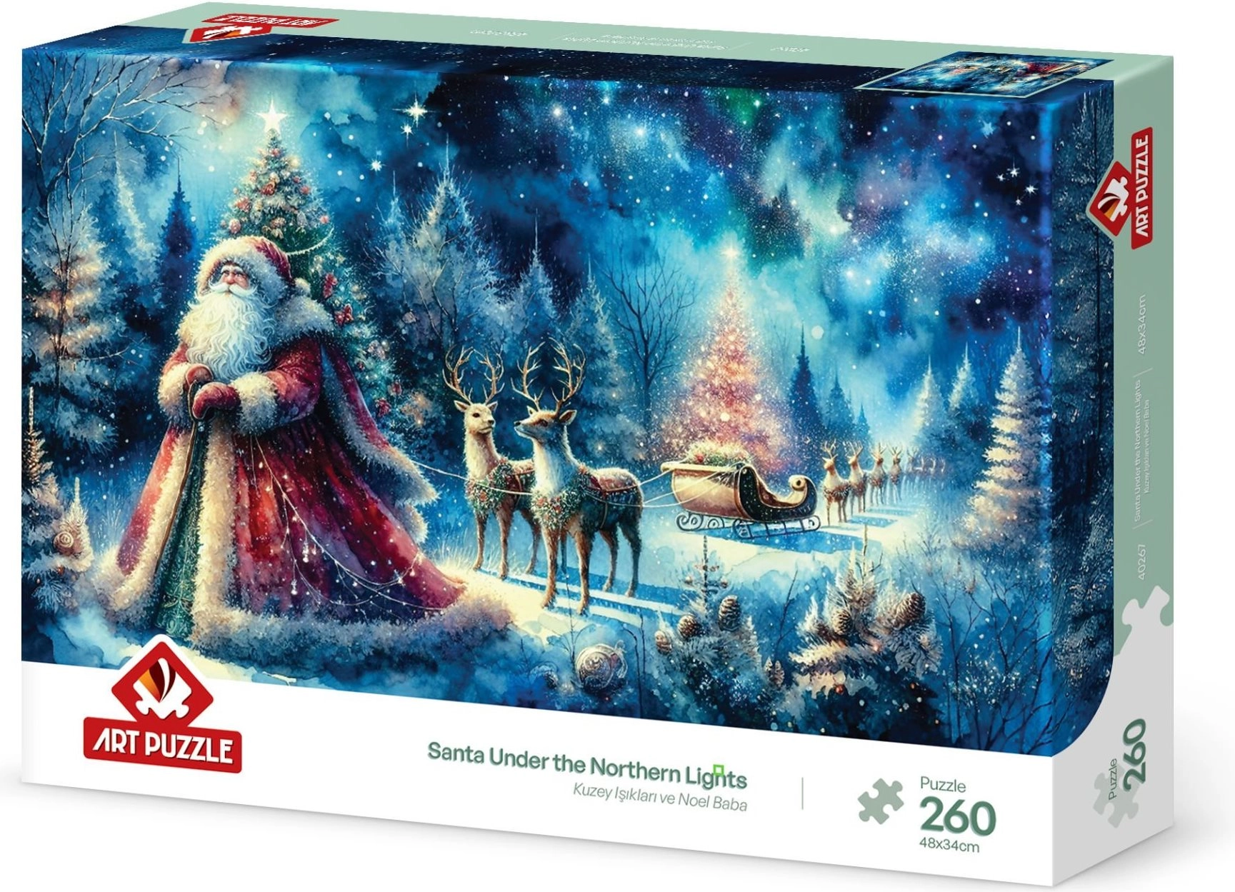 Genießen Sie die Weihnachtsatmosphäre mit dem wunderschönen Puzzle Weihnachtsmann unter dem Nordhimmel, das 260 Teile enthält. Perfekt für gemütliche Familienmomente beim Puzzeln und für Fans von winterlichen Themenpuzzles.