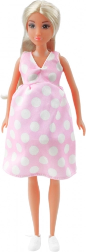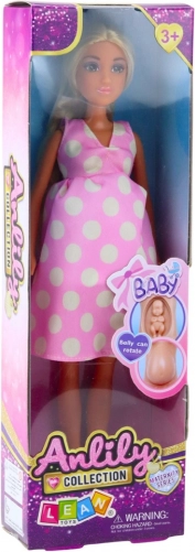 Schwangere Puppe Anlily ist ideal für Kinder, die kreatives Spielen und Familienrollen lieben. Stilvolle rosa Kleider mit weißen Punkten unterstreichen ihre Rolle als zukünftige Mutter.