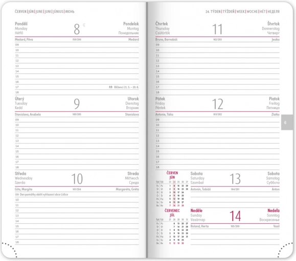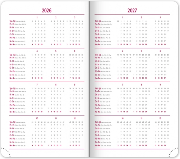 Wochenübersicht - Enthält ein tschechisch-slowakisches Kalendarium und zusätzlich Englisch, Deutsch, Ungarisch und Russisch.