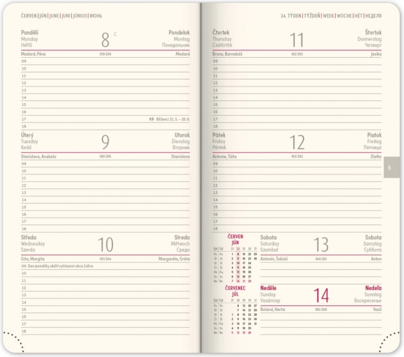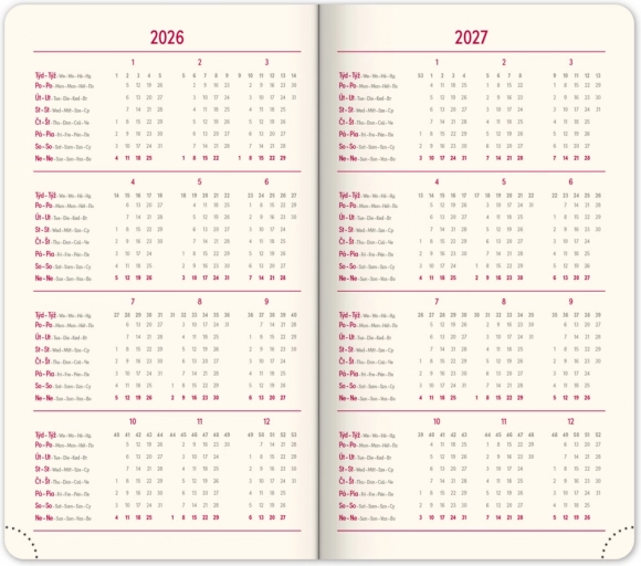 Der Diamante 2026 Kalender bietet exzellentes Zeitmanagement dank eines Wochenplans mit einem tschechisch-slowakischen Kalender und zusätzlichen Sprachen wie Englisch, Deutsch, Ungarisch und Russisch. Er ermöglicht Ihnen, Ihre Aktivitäten hervorragend mit einem Jahresplaner für die Jahre 2026 und 2027 zu planen.