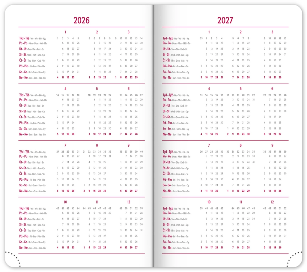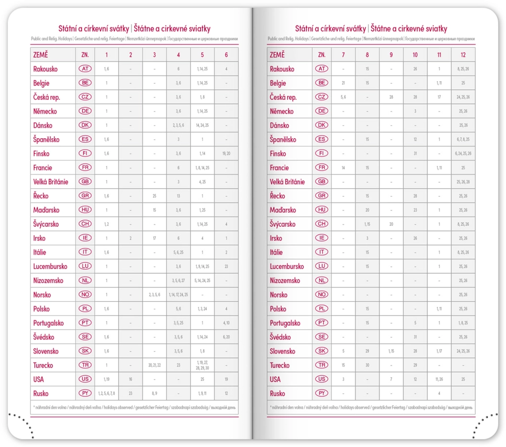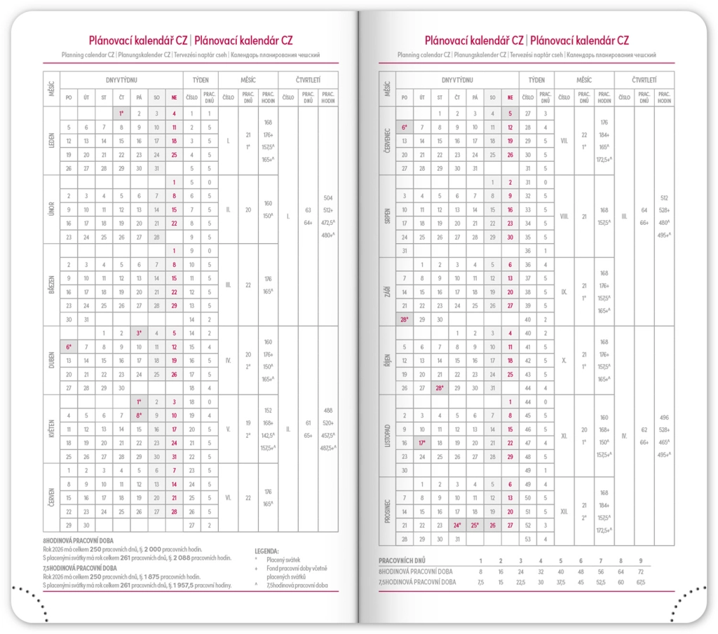 Der Kalender ist mit einem Wochenplan ausgestattet, der einen tschechisch-slowakischen Kalender ergänzt durch Englisch, Deutsch, Ungarisch und Russisch, was die internationale Planung erleichtert. Nützliche Funktionen umfassen: