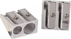 Robuster Metallanspitzer ideal für Schul- und Bürogebrauch. Dank des doppelten Lochs können sowohl dünne als auch dickere Buntstifte und Bleistifte gespitzt werden.