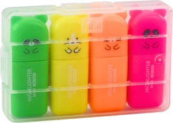 Erhalten Sie ein Set von vier verschiedenfarbigen Textmarkern, die sich hervorragend zum Lernen und für kreative Unterhaltung eignen. Das Plastikgehäuse erleichtert ihre Aufbewahrung und schützt sie vor Verlust. Diese Textmarker werden dank ihres freundlichen Designs und ihrer hochwertigen Verarbeitung ein unverzichtbarer Bestandteil von Schulranzen, Heimarbeitsplätzen und Geschenkpaketen für die Jüngsten.