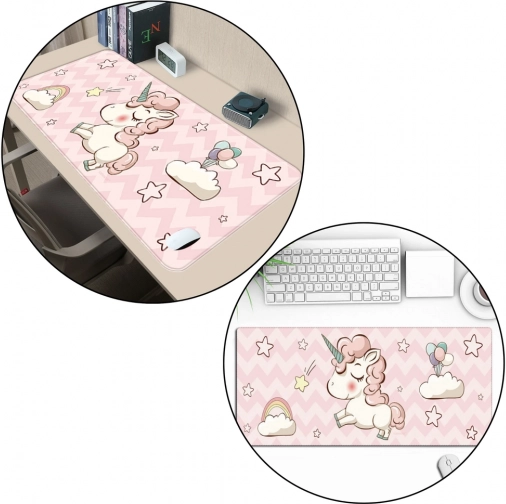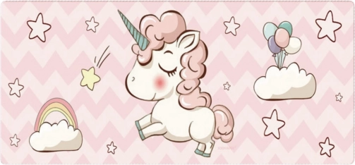 Die Matte besteht aus weichem, aber haltbarem Gummi, das eine stabile Haftung auf der Tischoberfläche gewährleistet und ein Verrutschen verhindert. Die obere Schicht des Materials ist angenehm zu berühren und abriebfest. Das rosafarbene Design mit Einhorn-, Wolken- und Sternchenmotiven schafft eine märchenhafte Atmosphäre und belebt den Raum.