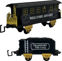Enthalten sind zwei detaillierte Wagen – ein Kohlewagen und ein Personenwagen. Sie lassen sich leicht ankoppeln und fahren sanft über die Strecke.