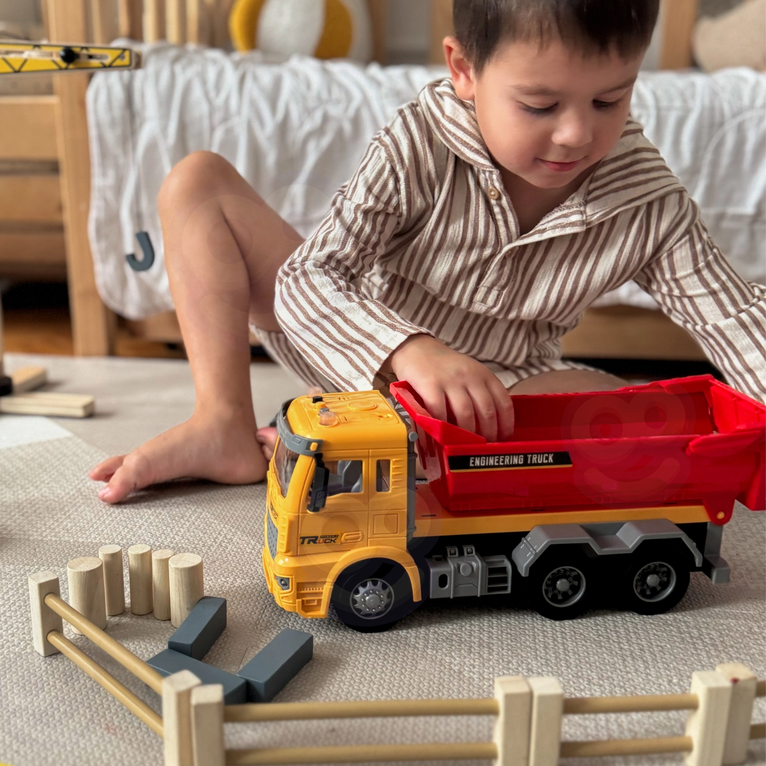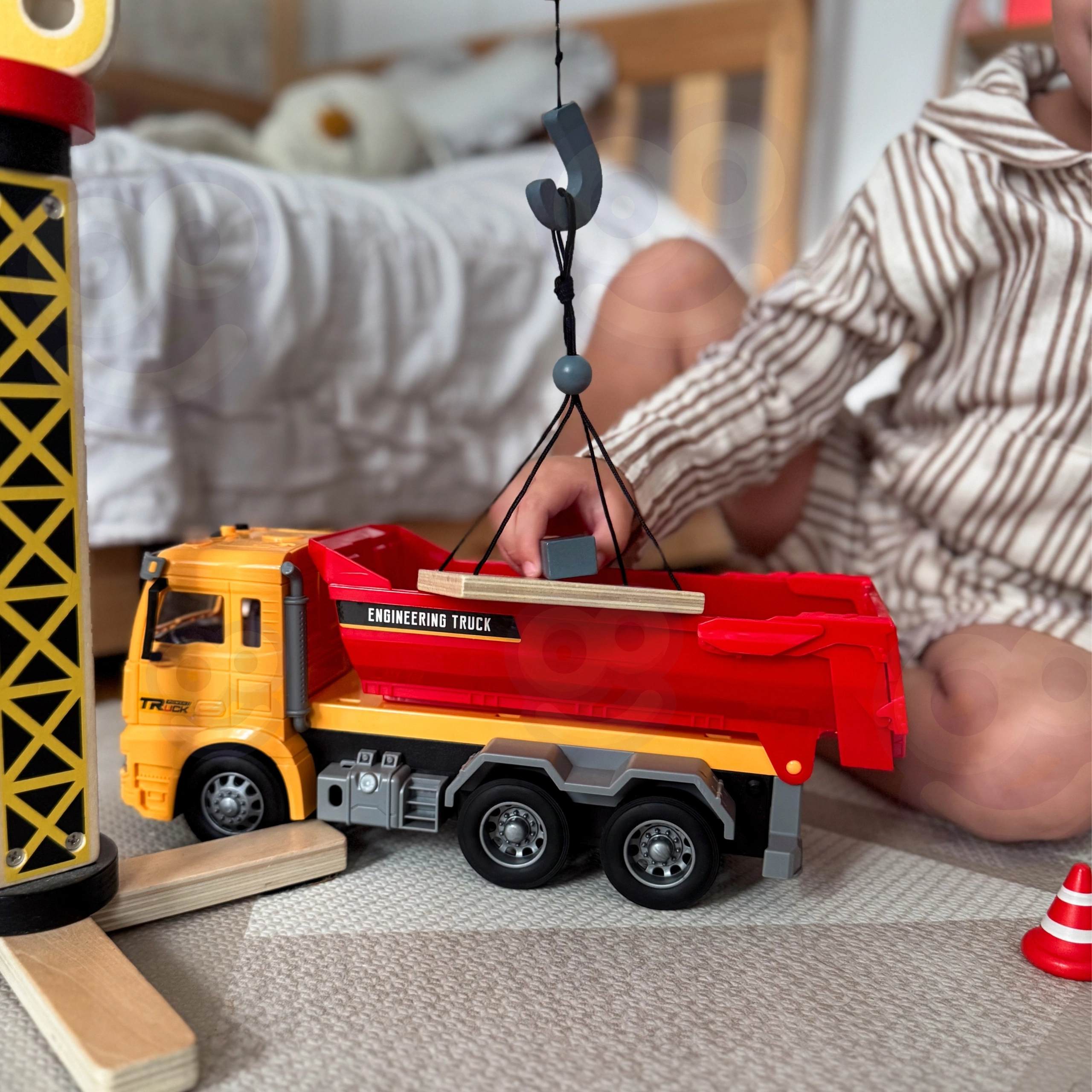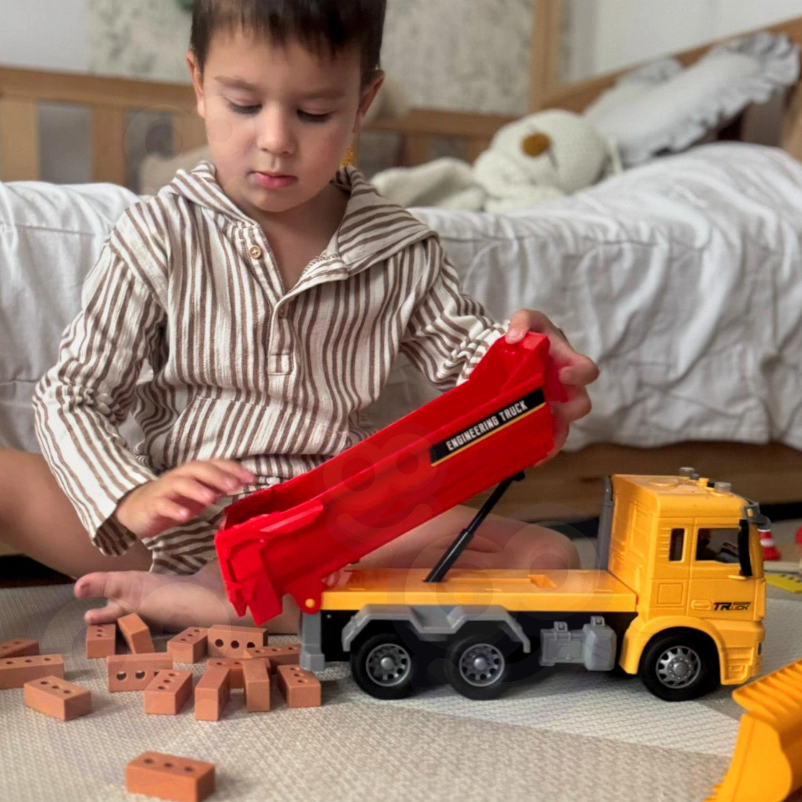 Dieser detailreich gestaltete Kinderkipper bringt das authentische „Baustellen“-Erlebnis direkt ins Kinderzimmer. Dank der funktionierenden kippbaren Ladefläche können Kinder Bausteine oder andere Kleinigkeiten laden, transportieren und auskippen, während die Lichter auf dem Kabinendach und die realistischen Geräusche das Rollenspiel kleiner Ingenieure und Baumeister unterstützen.