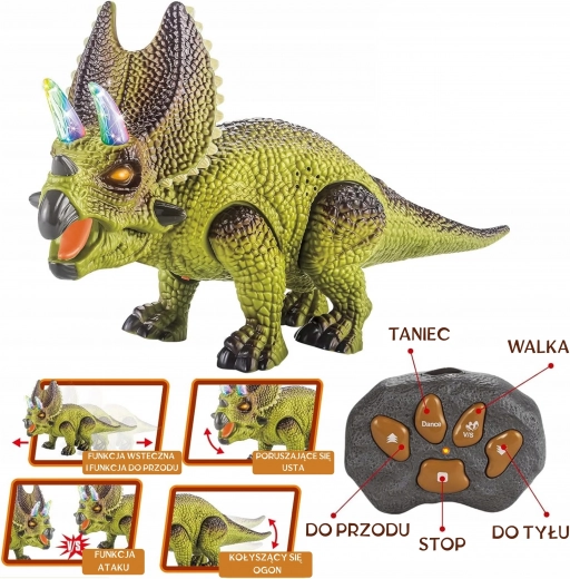 - Der Dinosaurier bewegt sich vorwärts und rückwärts, imitiert den Gang eines echten Triceratops
