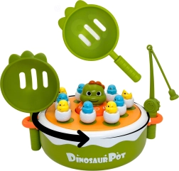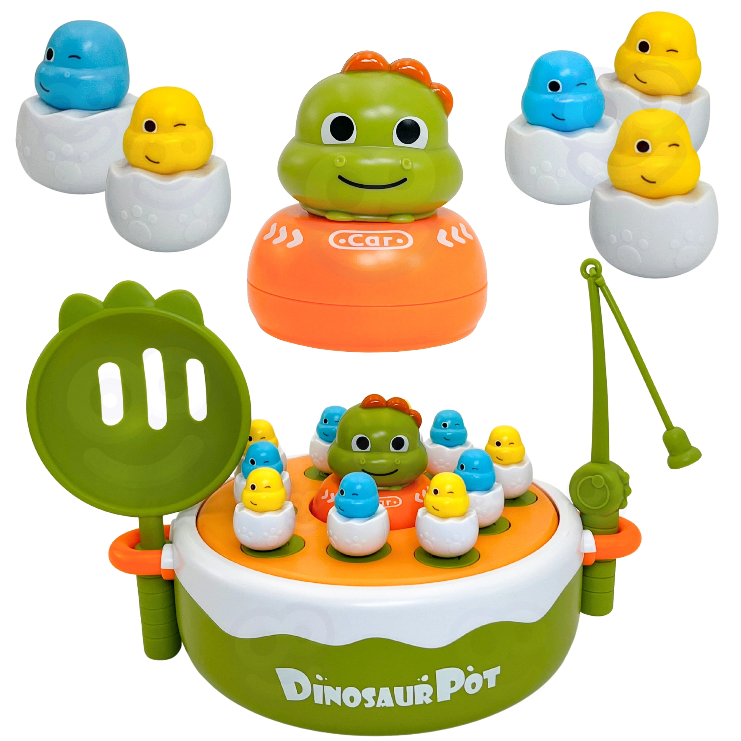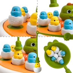 Die Spielbasis mit Griffen ist kompakt und bereit für schnelle Action: Kinder können die Dino-Küken mit der Magnetangel angeln oder sie katapultieren und mit Schaufeln fangen. Auf der anderen Seite der Basis finden sie Tic-Tac-Toe für einen ruhigeren Wettbewerb, und der große, niedliche Dinosaurier–Auto bringt eine weitere Dimension fantasievollen Spiels.