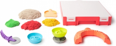 - 450 g Kinetic Sand in 4 Farben, 2 Pressen, 3 Werkzeuge, Box/Spielunterlage