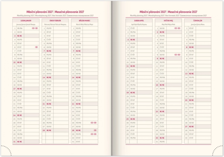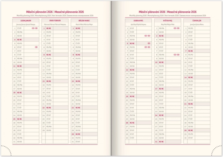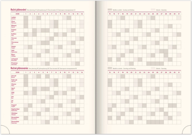 Moderner und eleganter Kalender mit Wochenübersicht im tschechisch-slowakischen Kalender. Ausgestattet mit einem festen Gummiband und einer Stiftschlaufe. Mehr anzeigen