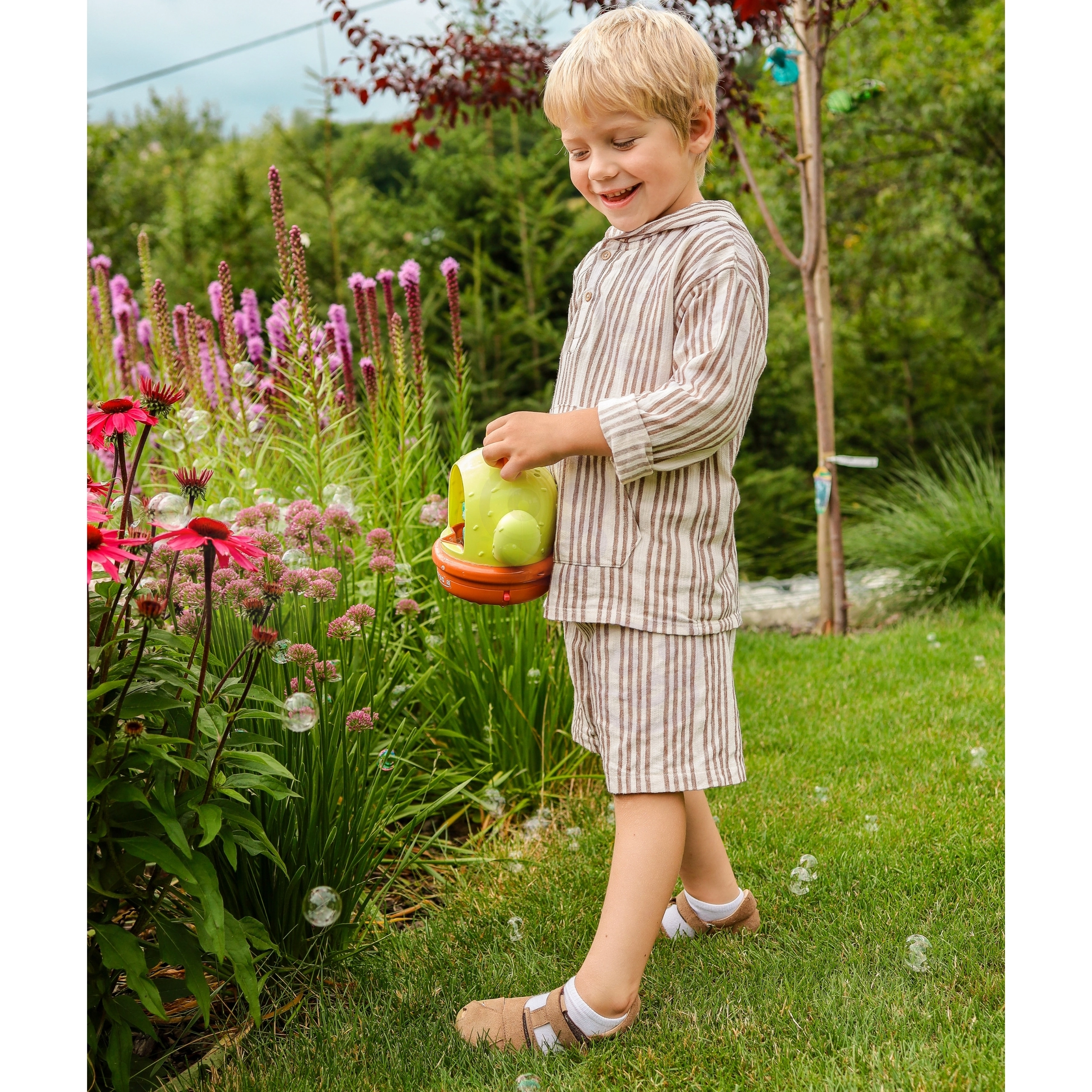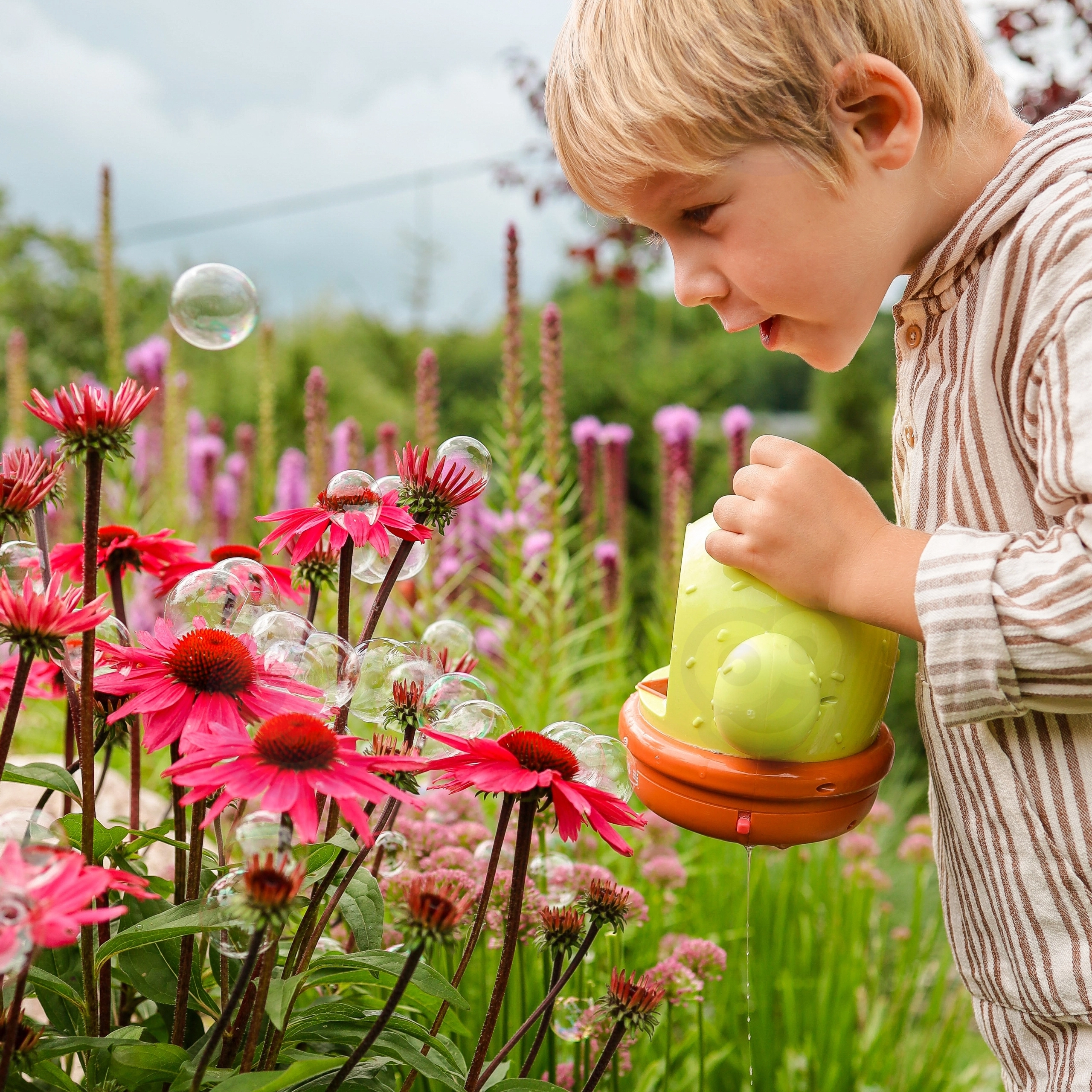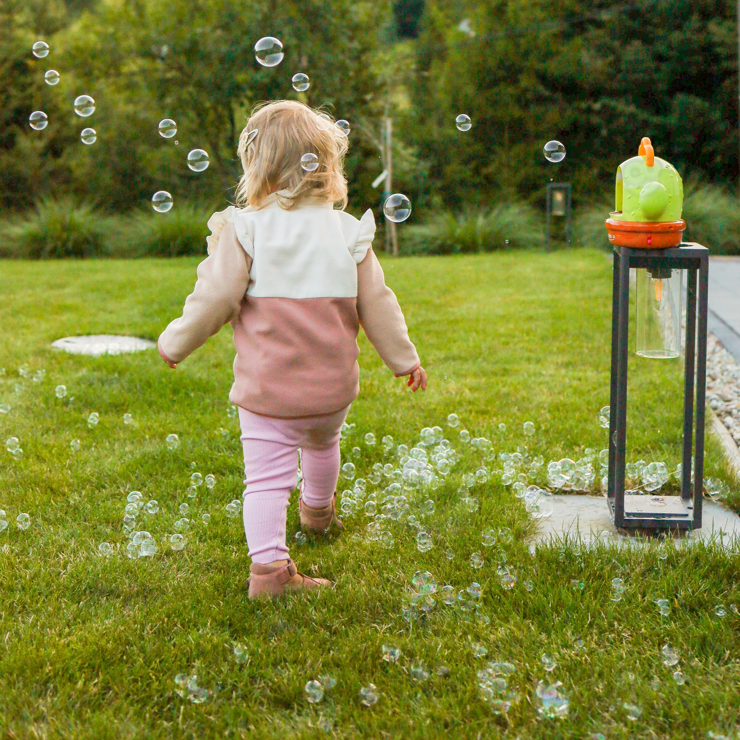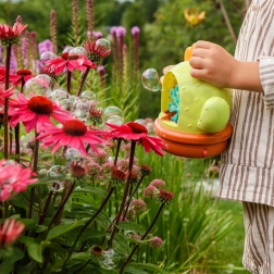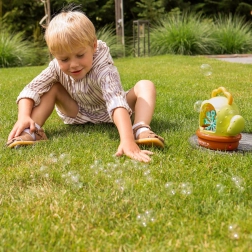 Das automatische Pusten erzeugt in wenigen Sekunden hunderte von Seifenblasen – ideal für Gartenpartys und Spielspaß im Kinderzimmer.