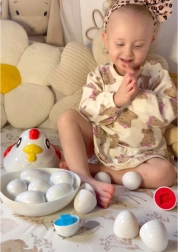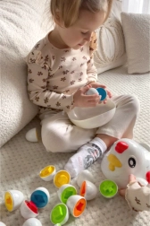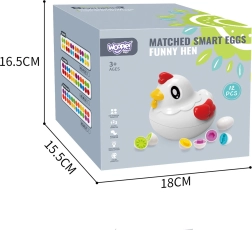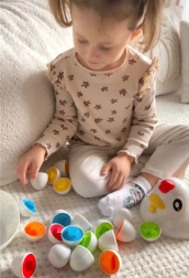 Buntes Küken-Sortiergerät der Marke WOOPIE ist ein multifunktionales Lernspielzeug, das Kindern hilft, durch Spielen wichtige Fähigkeiten zu entwickeln. Es bietet ein Set von Spielzeugen in Form von Eiern, die das Kind in die entsprechenden Öffnungen stecken muss, wobei es Formen, Farben erkennt und seine manuellen Fähigkeiten entwickelt.