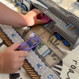 Der Lastwagen funktioniert als mobiler Transporter und als tragbarer Koffer für Autos und Zubehör. Kinder können so das gesamte Set überallhin mitnehmen.