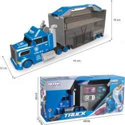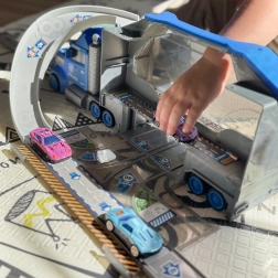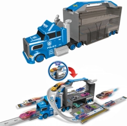 Der große Polizeilastwagen der Marke WOOPIE verwandelt sich im Handumdrehen von einer Transporteinheit für Autos in ein vollständiges Rennset mit Garage und Strecke. Beim Öffnen des Aufliegers kommt der innere Spielbereich mit Rampen, Loopings und Schildern zum Vorschein, wo Kinder spannende Rennen und Duelle veranstalten können.