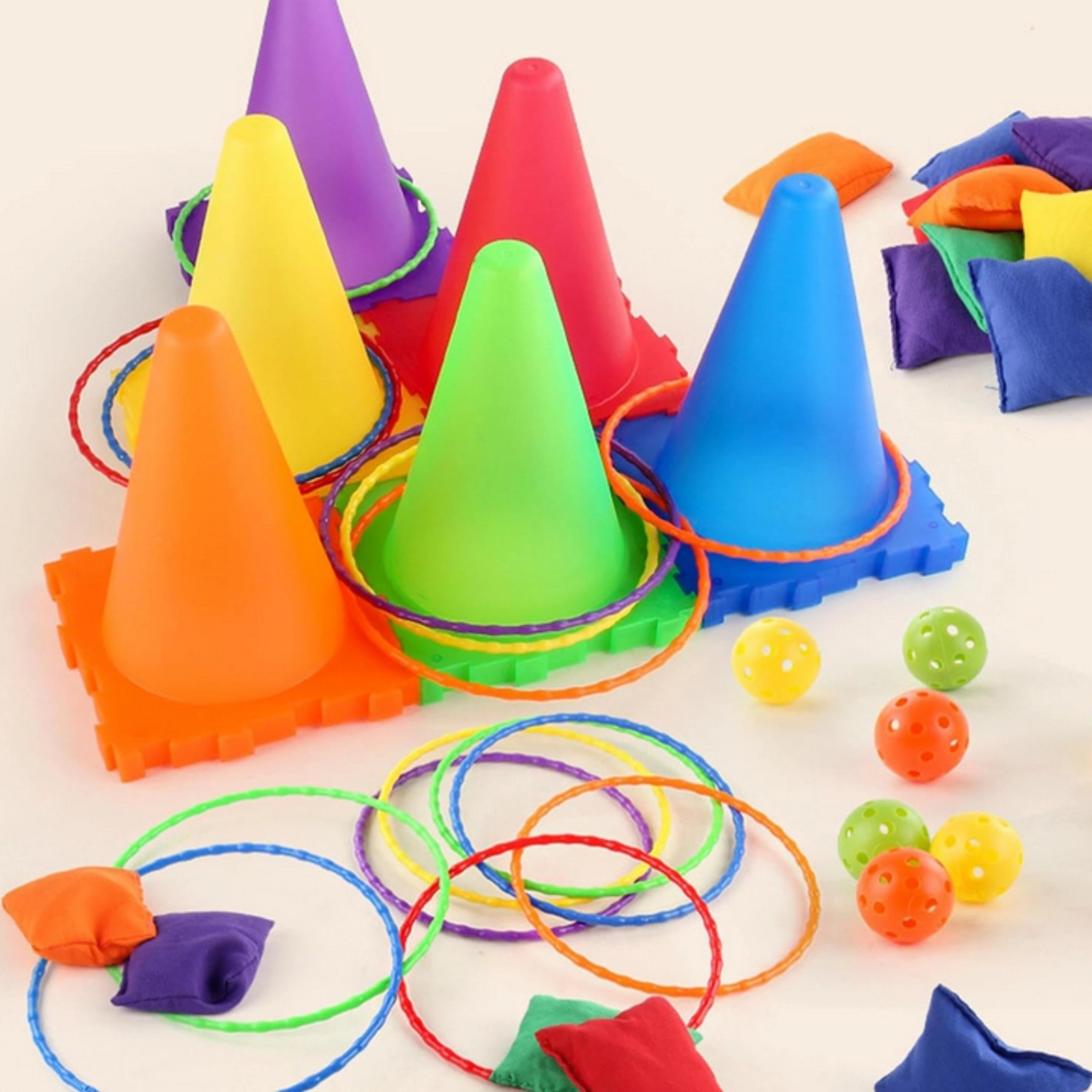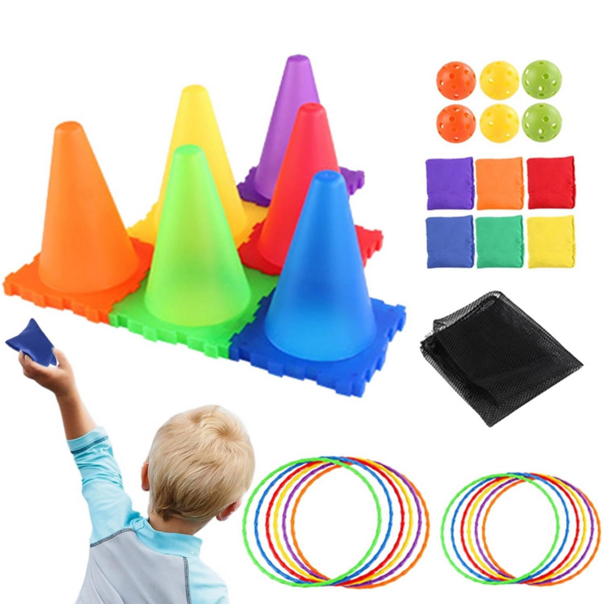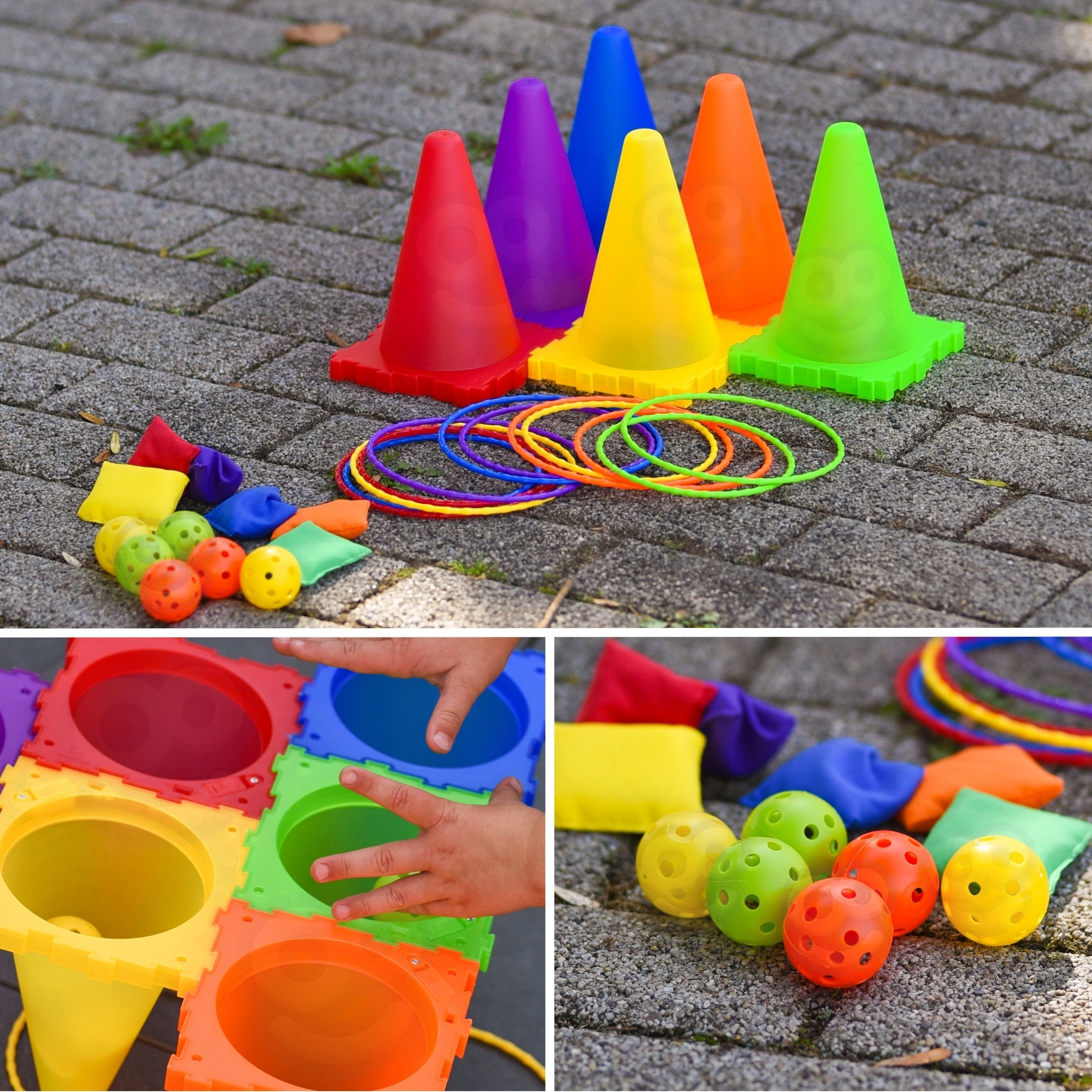 Im Set ist alles für drei beliebte Spiele enthalten: Ball Toss in die Kegel, Bean Bag Toss auf Ziele und Ring Toss auf die Kegel. Dank der leichten und sicheren Konstruktion geeignet für Outdoor und Indoor. Leuchtende Farben erhöhen die Sichtbarkeit und motivieren zur Bewegung.