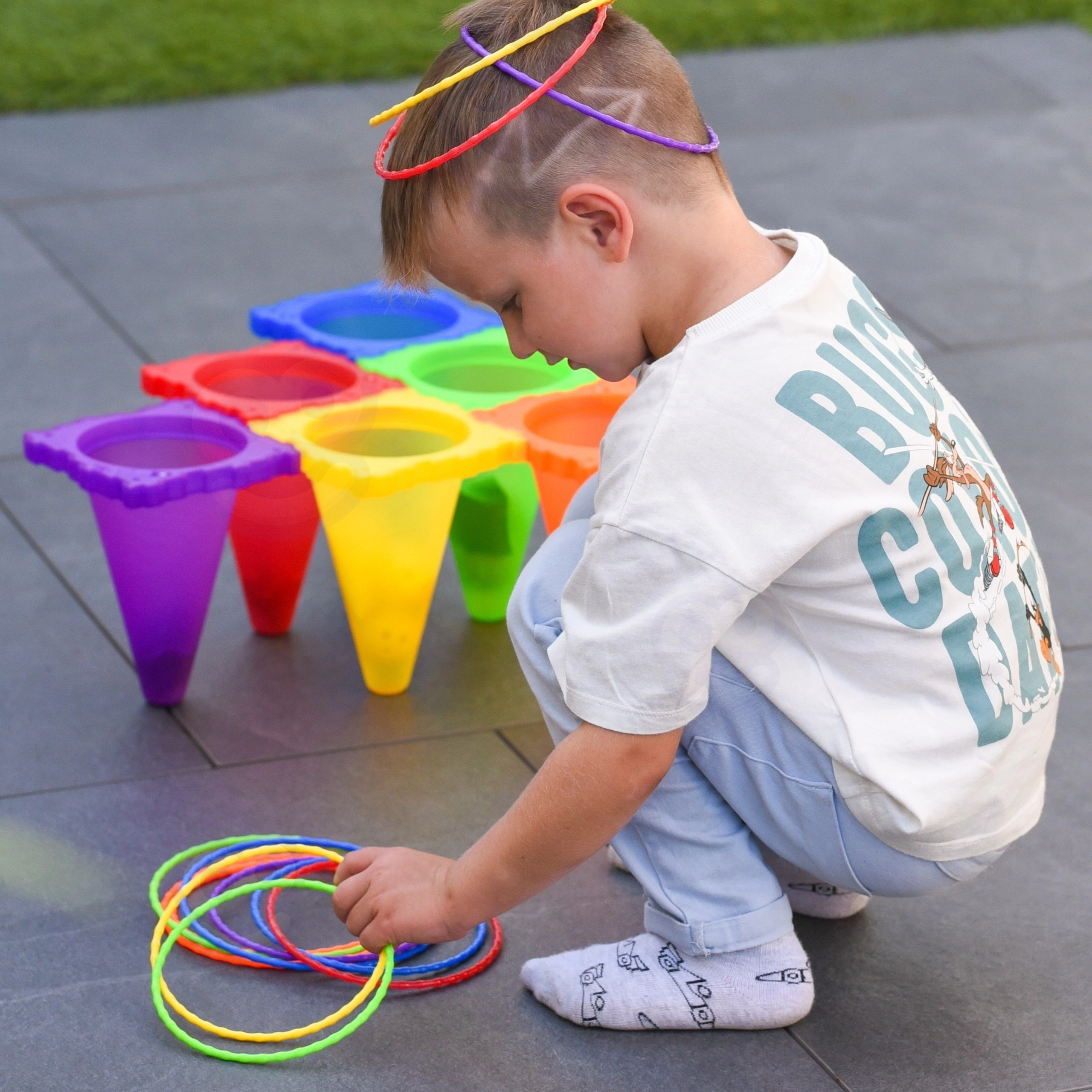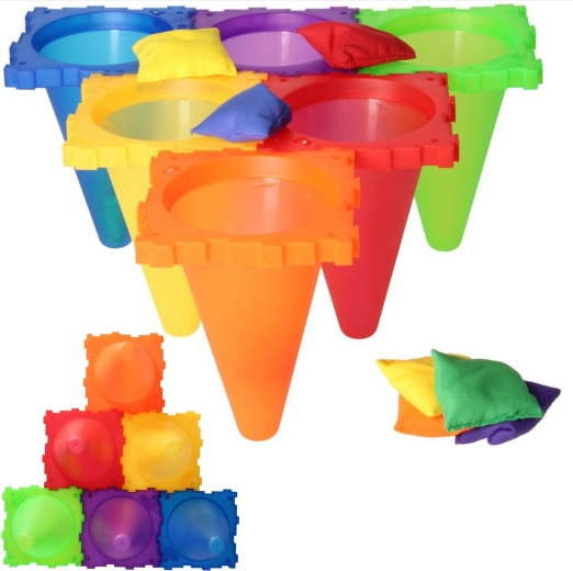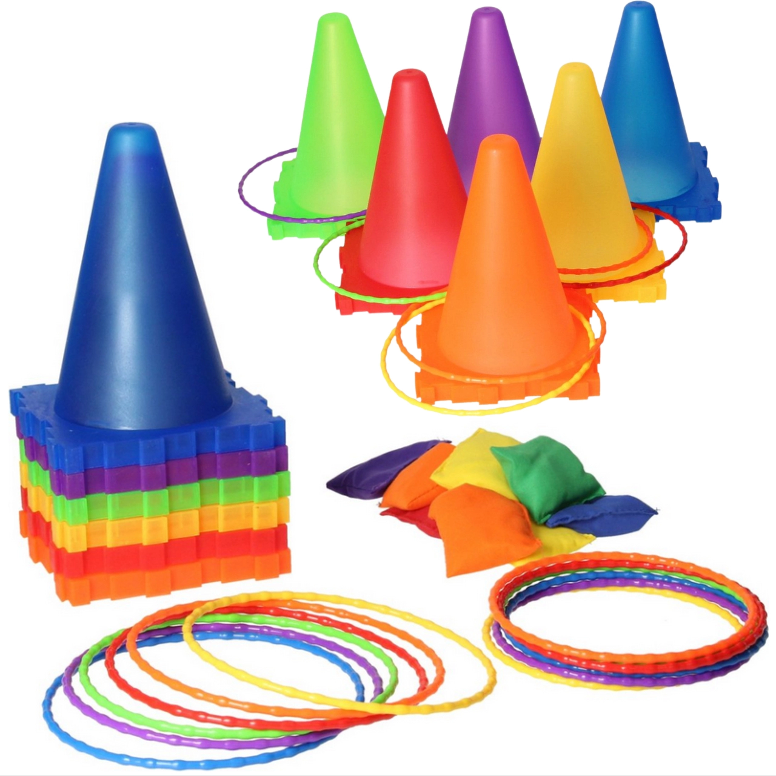 Im Set ist alles für drei beliebte Spiele enthalten: Ball Toss in die Kegel, Bean Bag Toss auf Ziele und Ring Toss auf die Kegel. Dank der leichten und sicheren Konstruktion geeignet für Outdoor und Indoor. Leuchtende Farben erhöhen die Sichtbarkeit und motivieren zur Bewegung.