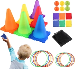 Leichte Kunststoffkegel, weiche Textilsäckchen und perforierte Bälle sind ideal für drinnen und draußen. Leicht zu reinigen und für intensives Spielen geeignet.