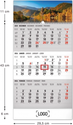 Praktischer Wandkalender mit Dreimonatslayout, Orientierungsleiste mit Schieber und nützlicher Jahresübersicht. Er bietet ein Kalendarium mit slowakischen Namen und Weltfeiertagen auf elegantem dunkelblauem Hintergrund – ideal für die Planung zu Hause und im Büro.