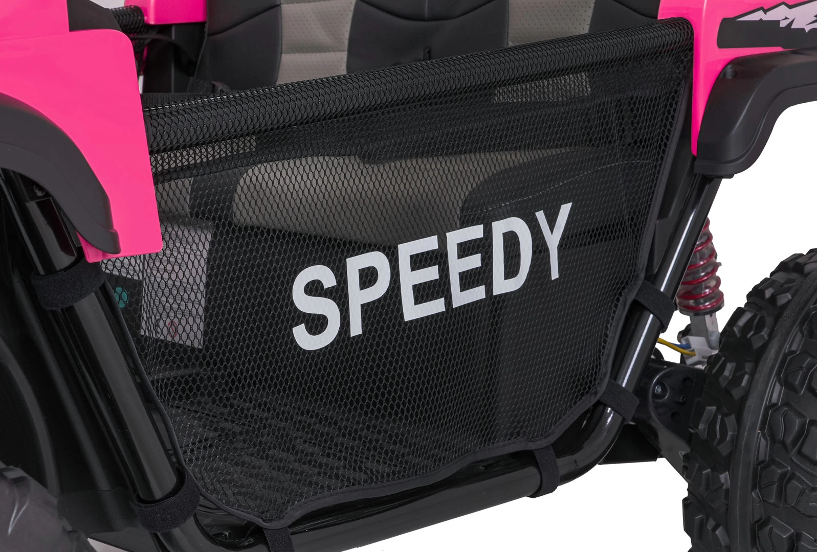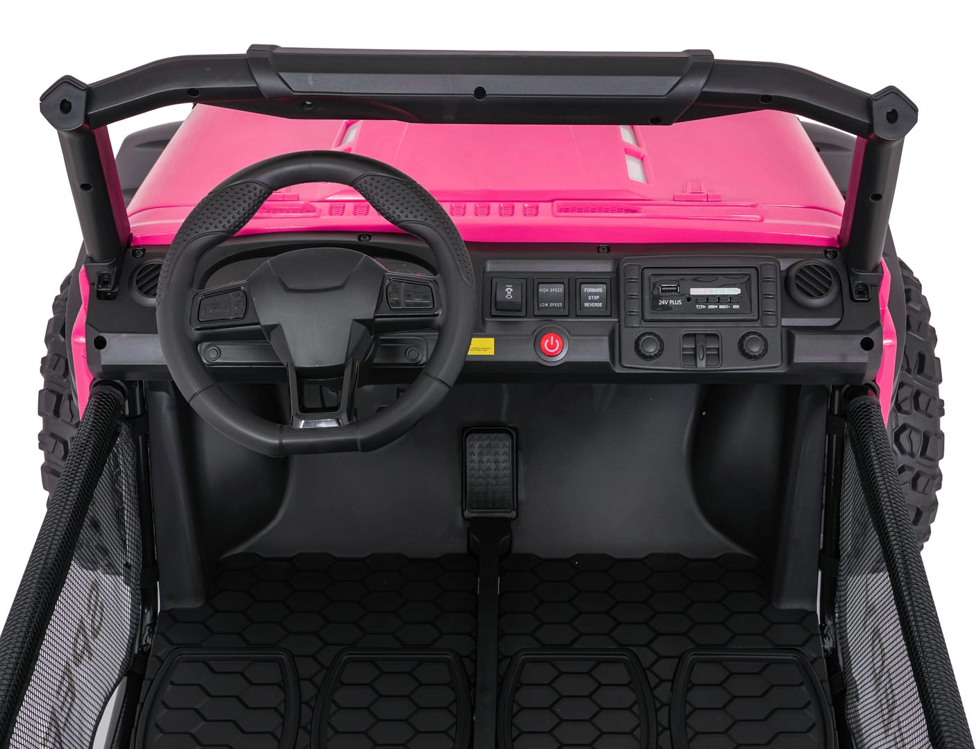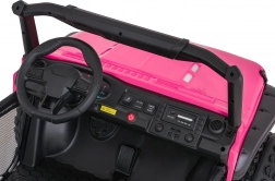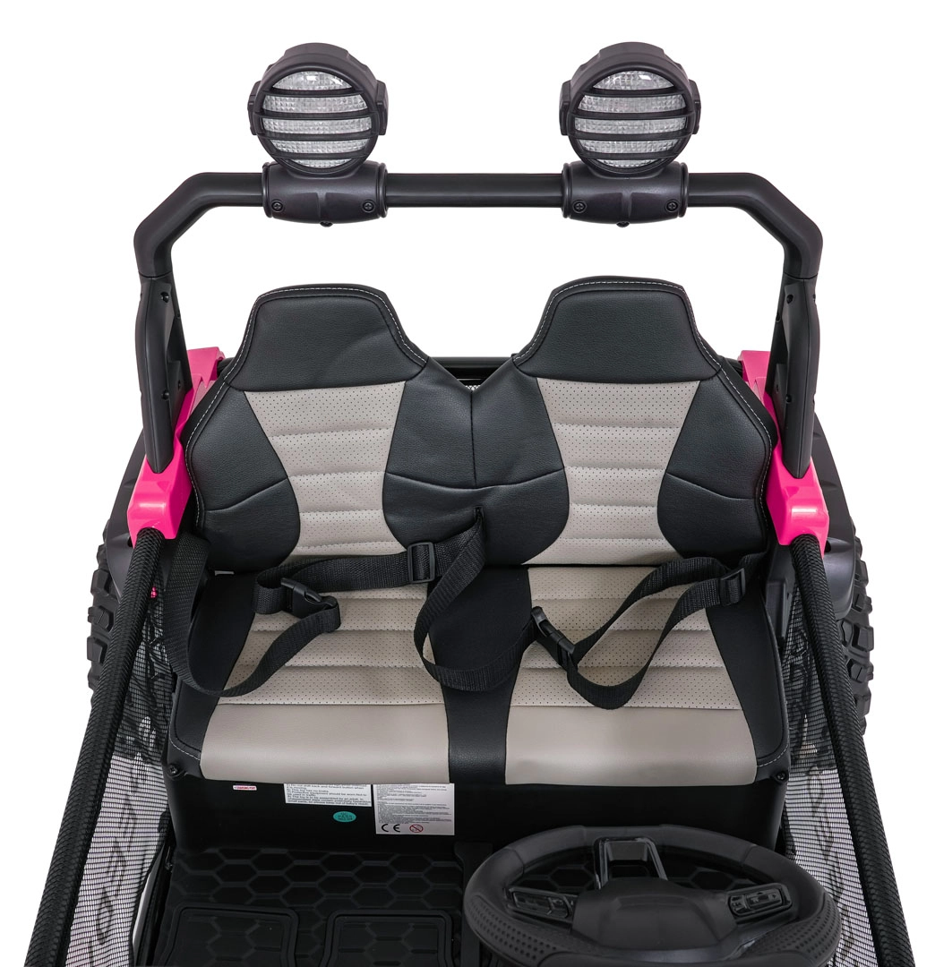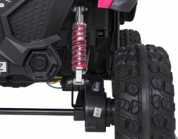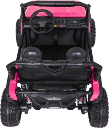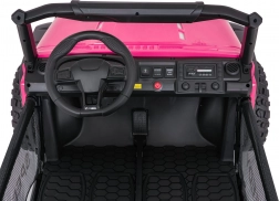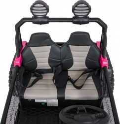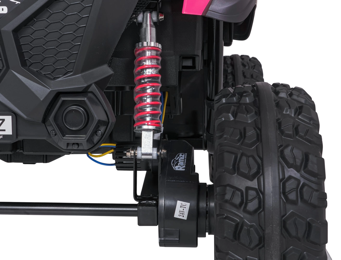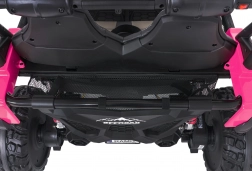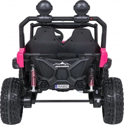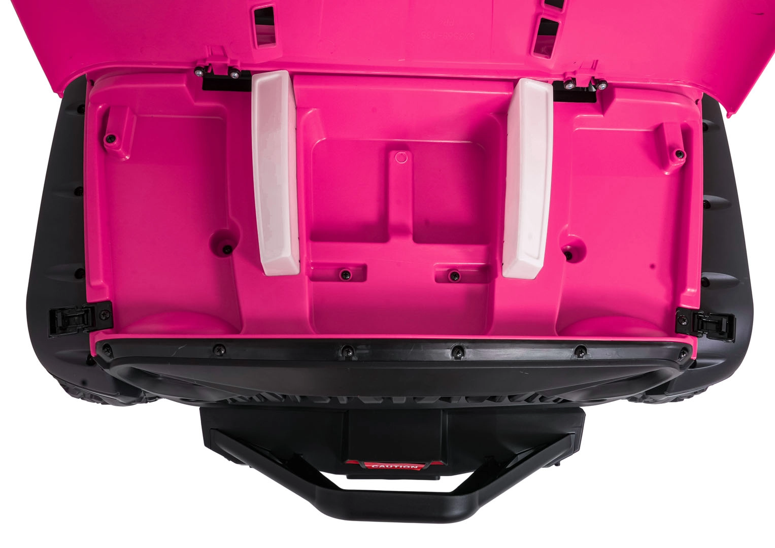 Das rosa PASSION 4x4 ist ein robustes Geländefahrzeug für Kinder, das starke Leistung, hohen Komfort und Sicherheit vereint. Vier 200-W-Motoren meistern Unebenheiten, einstellbare hintere Stoßdämpfer erhöhen die Stabilität und große EVA-Räder 31 × 12 cm rollen leise und sicher auf unterschiedlichen Untergründen. Der zweisitzige Kunstledersitz mit Sicherheitsgurten bietet auch auf längeren Ausfahrten viel Komfort.