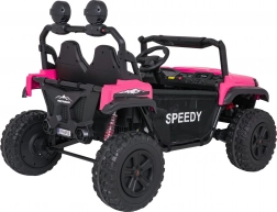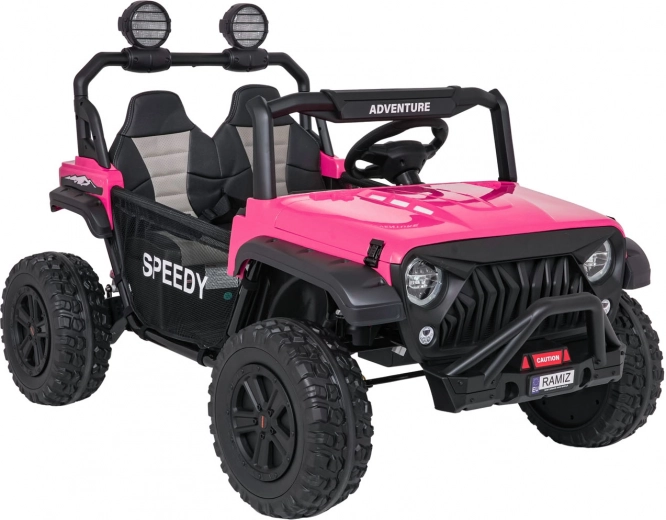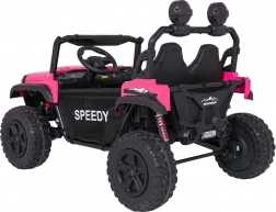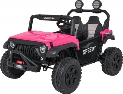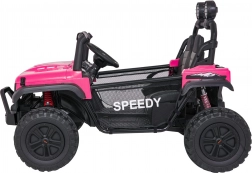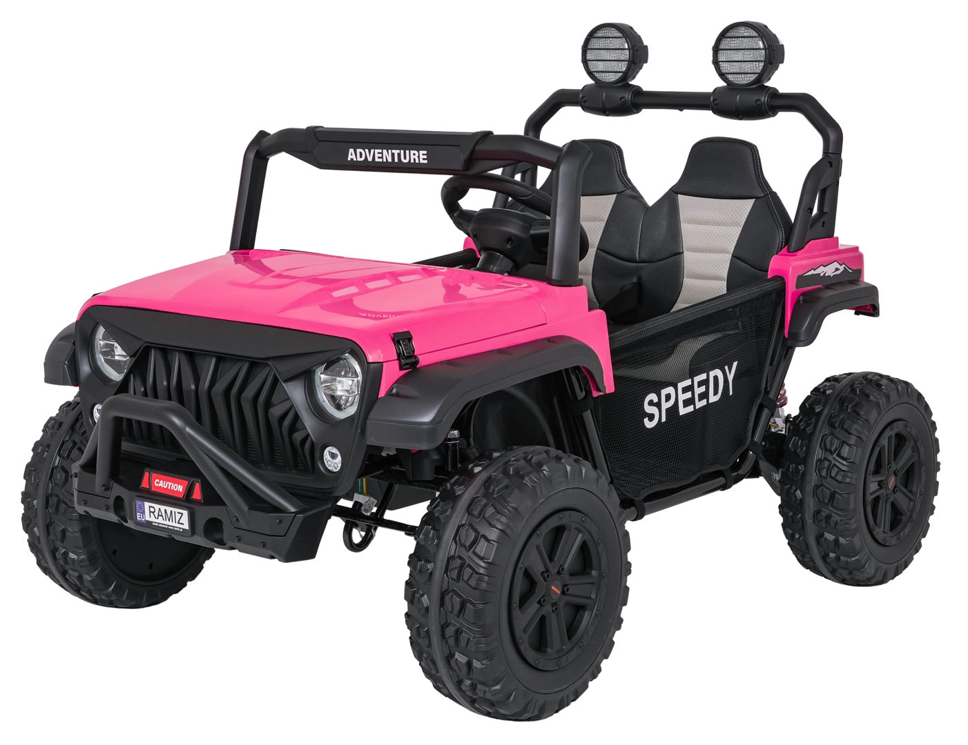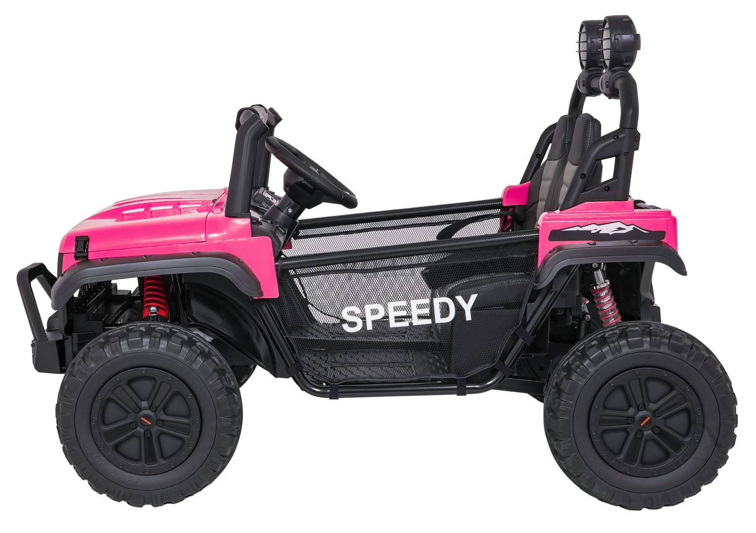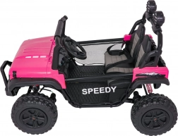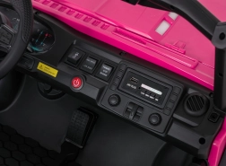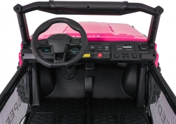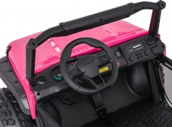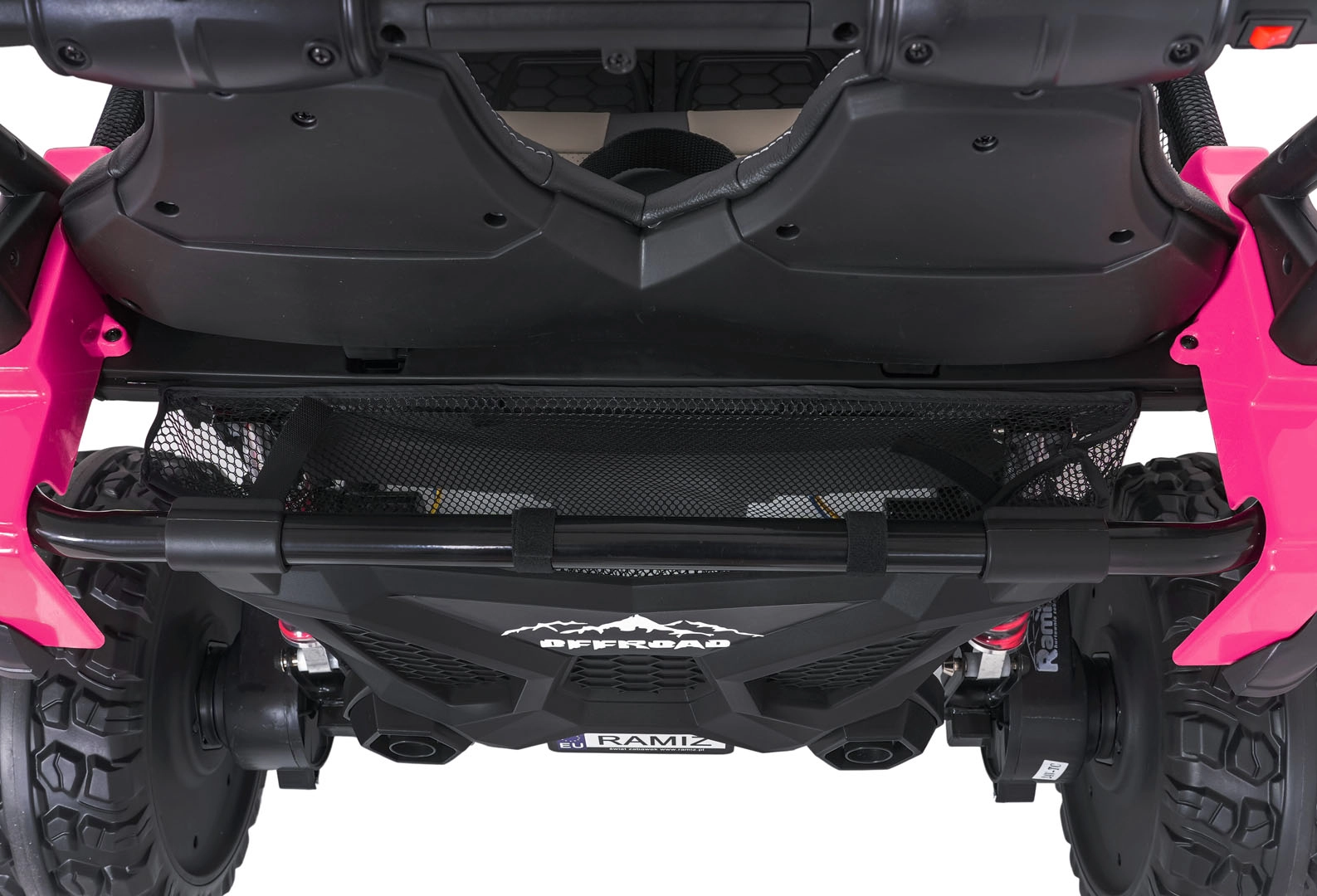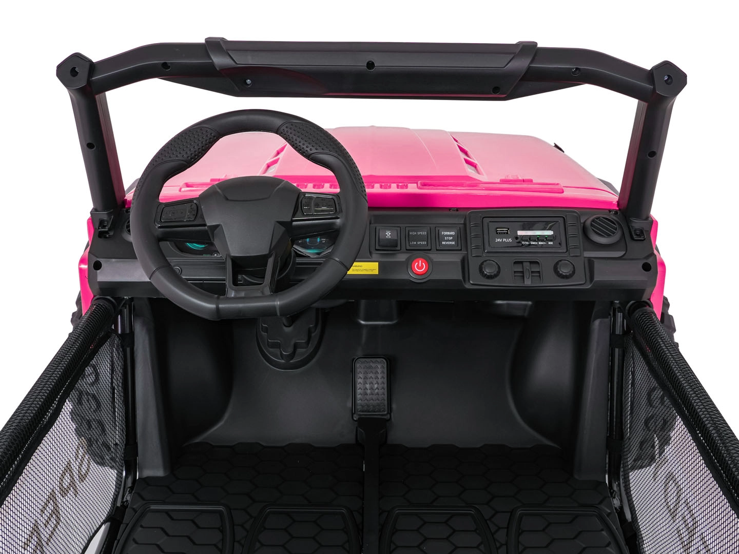 Das rosa PASSION 4x4 ist ein robustes Geländefahrzeug für Kinder, das starke Leistung, hohen Komfort und Sicherheit vereint. Vier 200-W-Motoren meistern Unebenheiten, einstellbare hintere Stoßdämpfer erhöhen die Stabilität und große EVA-Räder 31 × 12 cm rollen leise und sicher auf unterschiedlichen Untergründen. Der zweisitzige Kunstledersitz mit Sicherheitsgurten bietet auch auf längeren Ausfahrten viel Komfort.