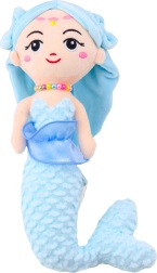 Dieses Spielzeug hat ein gesticktes Gesicht mit sanftem Lächeln, kleinen Verzierungen auf der Stirn und langen blauen Haaren mit einer dekorierten Haarbinde. Eine Besonderheit ist ihr Barett aus bunten Perlen und der textile Rüsche am Bund, die zum Stil der Meerjungfrau passt.