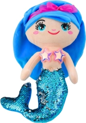 Das Spielzeug hat große, gestickte Augen, ein lächelndes Gesicht, blaue Haare, die mit einer rosa Schleife verziert sind, und einen auffälligen, mit Pailletten bedeckten Schwanz. Die Pailletten ändern ihre Farbe von Blau zu Silber, wenn man darüber streicht, was dem Kind viel Freude bereitet und seinen Tastsinn und seine Vorstellungskraft stimuliert.