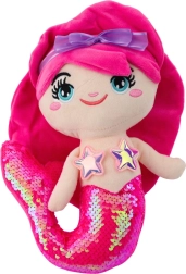 Die Meerjungfrau hat große, gestickte Augen, ein lächelndes Gesicht, langes rosa Haar mit Schleife und eine Paillettenflosse. Der mit beidseitigen Pailletten bedeckte Schwanz, der sich beim Streichen mit der Hand von glänzend zu matt verändert, stimuliert den Tastsinn und das Sehvermögen von Kindern.