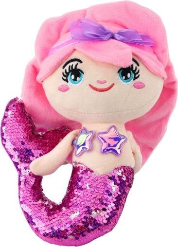 Dieses Spielzeug hat große bestickte Augen, ein lächelndes Gesicht, rosa Haare mit einer Schleife verziert und eine effektvolle Flosse, die mit Pailletten bedeckt ist. Die Pailletten wechseln die Farbe von lila zu silber, wenn man mit der Hand darüberstreicht, was den Kindern Freude bereitet und ihren Tastsinn und ihre Fantasie anregt.