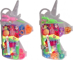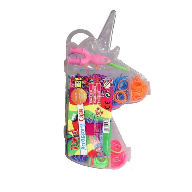 Alles ist übersichtlich in einer praktischen Plastikbox in Einhornform verpackt, die kleinere, getrennte Boxen für eine organisiere Aufbewahrung der Gummibänder nach Farben enthält. Dieses Set ist nicht nur unterhaltsam, sondern fördert auch die Kreativität und Feinmotorik von Kindern.