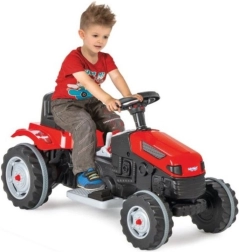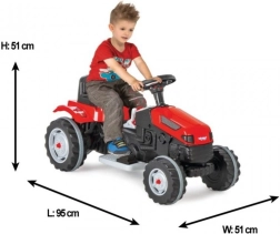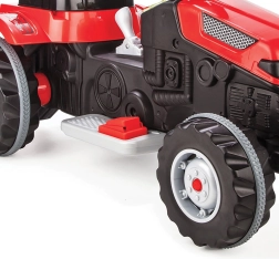 Der Traktor ist mit einem Hebel für Vorwärts- und Rückwärtsfahrt ausgestattet, was die Bedienung erleichtert. Er verfügt außerdem über eine Hupe für akustische Signale und eine automatische Bremse, die aktiviert wird, wenn das Kind den Fuß vom Gas nimmt, was die Sicherheit des Benutzers garantiert.