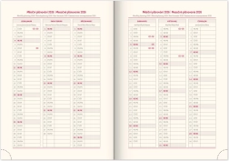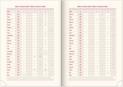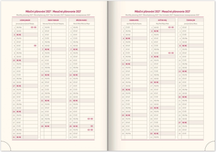 Tägliches Layout mit einem tschechisch-slowakischen Kalender und zusätzlichen Sprachversionen in Englisch, Deutsch, Ungarisch und Russisch.