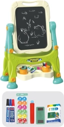 Die beidseitige Bildungstafel ist mit einer 360° Drehfunktion ausgestattet, die einen schnellen Wechsel der Arbeitsfläche ohne Demontage ermöglicht. Ihre Höhe ist an die Bedürfnisse der Kinder angepasst und stabile Standfestigkeit bietet ein fester Ständer mit breiter Basis. Ein praktisches Regal mit bunten Behältern hilft, Ordnung im Zeichenmaterial zu halten.