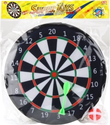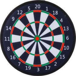 Im Set enthalten ist eine dunkle Dartscheibe mit einem Durchmesser von 28 cm, ein Dart und ein Ball, beide mit Klettverschluss. Die Scheibe hat eine gut lesbare Numerierung und farbige Zonen, die nicht nur das Lernen erleichtern und die Reflexe verbessern, sondern auch beim Spielen drinnen und draußen nützlich sind.