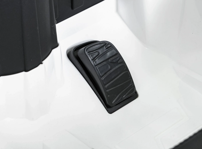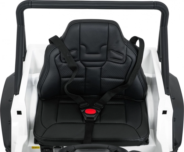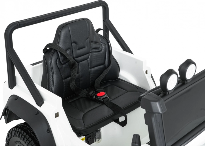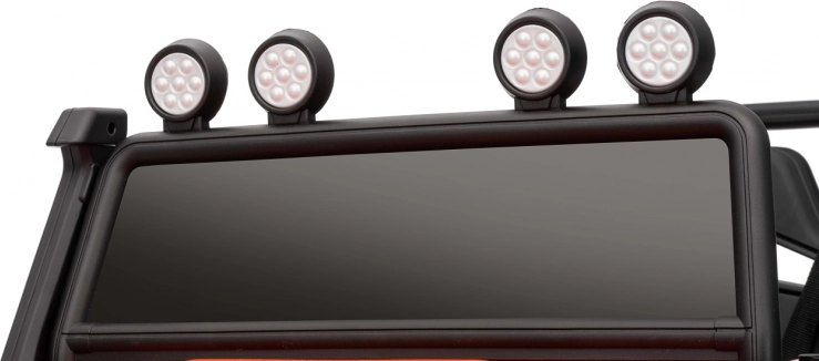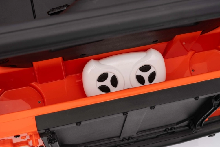 Das Auto ist mit LED-Lichtern (2 Modi) mit Schalter, öffnenden Türen, einem gepolsterten Sitz aus Kunstleder mit Sicherheitsgurten und einer gut sichtbaren Ladezustandsanzeige ausgestattet. Das Multimedia-Panel mit Bluetooth, USB, AUX und MP3 bringt Lieblingsmusik, außerdem gibt es vorinstallierte Melodien und eine Hupe am Lenkrad.