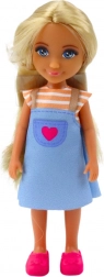 Der Set Mini Puppe mit Hund und Welpen enthält eine 13 cm große Puppe, gekleidet in ein farbenfrohes Trägerkleid und rosa Schuhe. Ihr zartes Gesicht und langes blondes Haar verleihen der Puppe einen einzigartigen Charme.