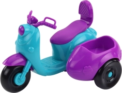 Die Puppe fährt auf einem dreirädrigen Roller in intensiven türkis-lilanen Farben. Der Anhänger an der Seite des Rollers birgt einen kleinen Hund mit rotem Halsband – einen treuen Begleiter auf jeder Reise. Das Set ist aus robustem, sicherem Plastik gefertigt und ideal für tägliches Spielen.