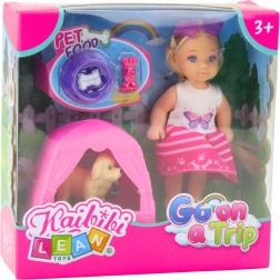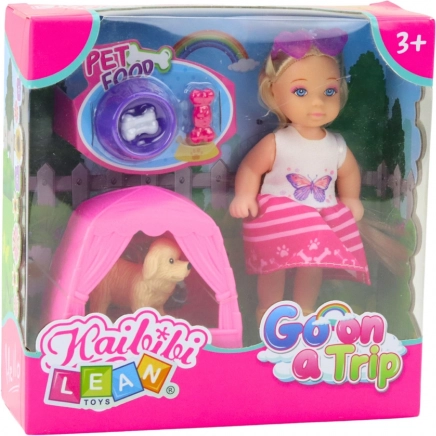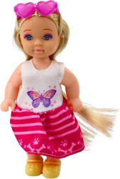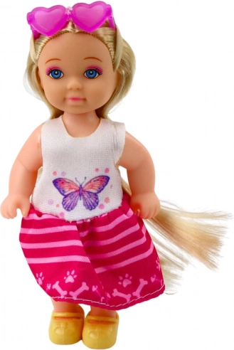 Dieses bezaubernde Set entführt Kinder in eine Welt der fürsorglichen Pflege und spielerischen Unterhaltung mit Haustieren. Die Puppe ist 12 cm groß und trägt ein buntes Outfit: ein weißes T-Shirt mit Schmetterlingsaufdruck, einen rosa Rock mit Pfotenmuster und gelbe Schuhe. Auf dem Kopf trägt die Puppe rosa herzförmige Brillen, die ihr charakteristischen Ausdruck verleihen.