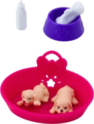 Kinder können sich auf zwei kleine Welpen freuen, um die sie sich kümmern, füttern und in ein rosa Bettchen mit Pfotenmuster legen können. Mit der Fütterungsflasche und der lila Schale mit Knochen können Kinder realistische Pflegeszenen nachspielen und so Empathie, Kreativität und manuelle Fähigkeiten entwickeln.
