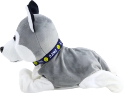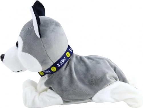 Der interaktive Plüschhund Husky ist das perfekte Spielzeug für Kinder, das ein niedliches Aussehen mit realistischen Funktionen verbindet. Der Hund besteht aus weichem und angenehmem Plüsch in Weiß- und Grautönen, und sein freundliches Aussehen sowie blaue Augen ziehen die Aufmerksamkeit der Kleinsten auf sich. Um den Hals trägt er eine dekorative Schleife mit dem Aufdruck 'SMILE' und Emojis, die dem Hund Charakter verleihen.
