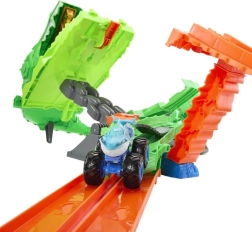 Starte ein adrenalingeladenes Duell im Themen-Set „Haie vs. Dinosaurier: Drachenrennen“. Setze beide Trucks in den Doppel-Launcher und schicke sie im Parallelrennen direkt auf das Maul des kybernetischen Drachens zu. Die Sägeblatt-Weiche entscheidet per Zufall, ob die Fahrzeuge stoppen, einer von der Strecke fliegt oder beide durchrasen und den Drachen zu Fall bringen.