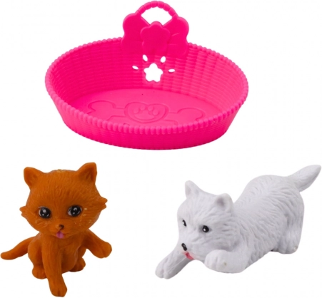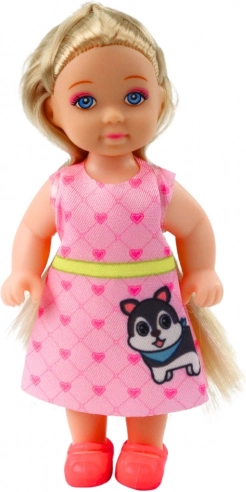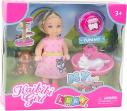 Die Mini-Puppe mit Hund und Katze mit Zubehör ist ideal für kleine Tierpfleger. Die Puppe mit einer Höhe von 12 cm, gekleidet in einem rosa Kleid mit Herzchen, wird von plastischen Tierfiguren begleitet. Das Set enthält: