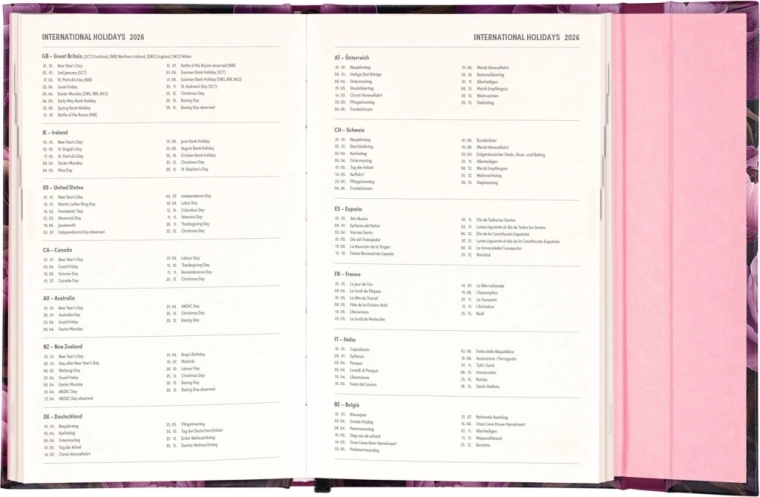 Eleganter wöchentlicher Planer auf Englisch mit internationalen Feiertagen und einem praktischen magnetischen Verschluss, der Ihnen hilft, alles unter Kontrolle zu haben.