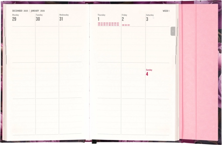 Er enthält auch monatliche Übersichten, die ideal für die Planung von Urlaub oder Ferien sind. Der Planer ist nicht nur praktisch, sondern durch das Design mit violetten Blumen auch eine stilvolle Ergänzung für Ihren Schreibtisch.
