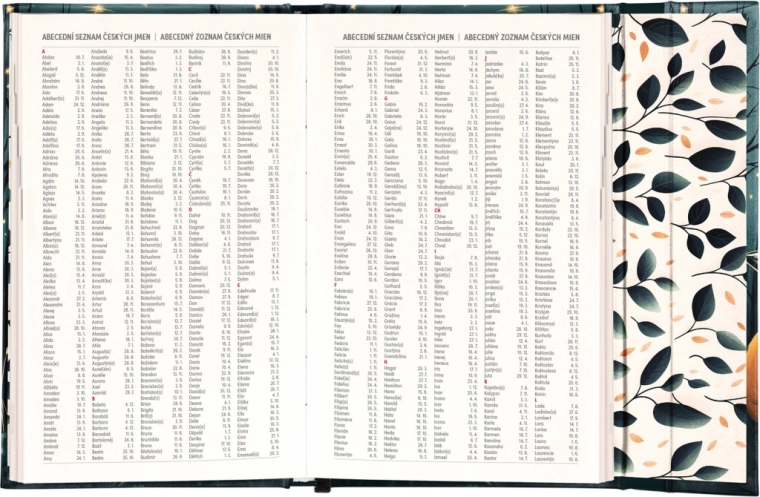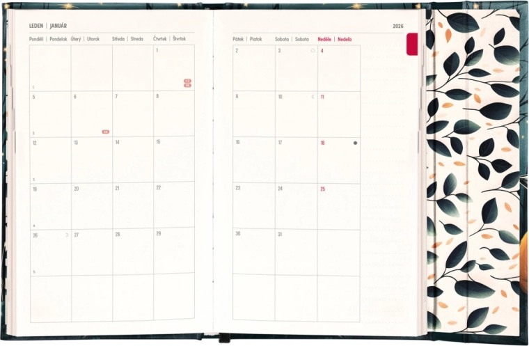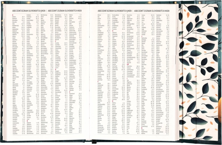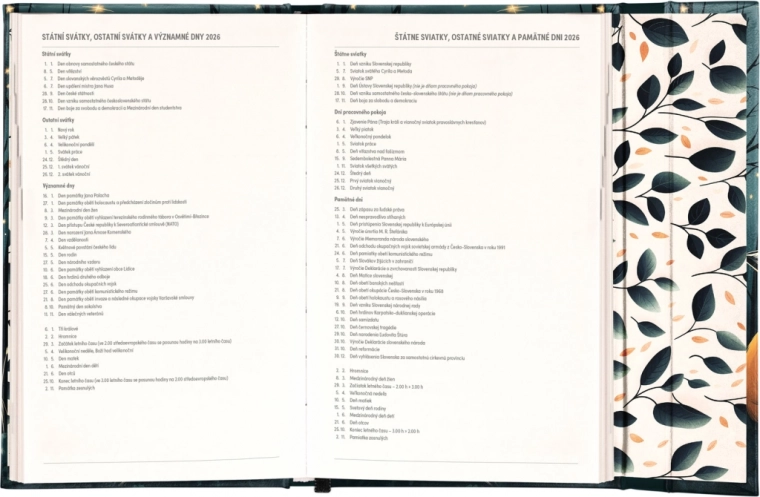 Er ist mit monatlichen Übersichten ausgestattet, die eine leichtere Planung längerer Zeiträume wie Urlaub oder Schulferien ermöglichen. Dieser Planer enthält auch eine Liste tschechischer und slowakischer Feiertage und Namenstage, die eine bessere Organisation der Freizeit ermöglicht.