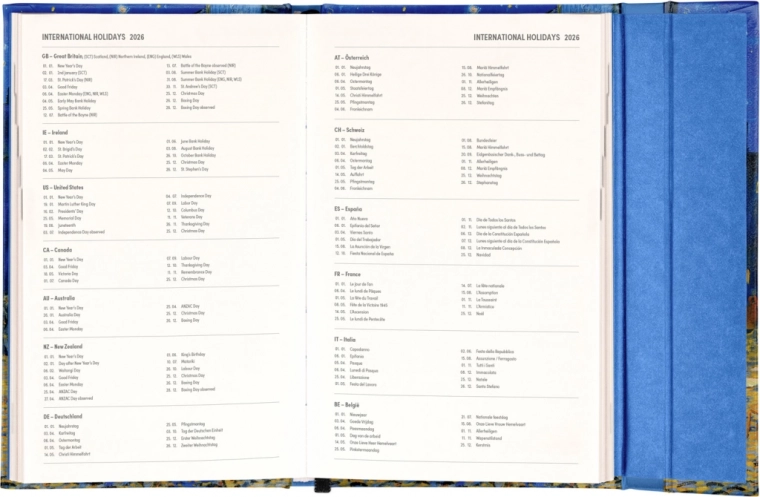 Der Planer ist in der Größe 13 x 21 cm erhältlich, was die ideale Größe für Taschen oder Rucksäcke ist. Er beinhaltet auch internationale Feiertage, was nützlich für Benutzer ist, die häufig reisen oder internationale Kundschaft haben.