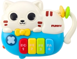 Das Mini-Klavier enthält vier große, bunte Tasten, bezeichnet als DO, RE, MI, FA - jede von ihnen gibt einen anderen Klang ab und aktiviert Lichteffekte, was die Attraktivität des Spiels erhöht. Auf dem Gehäuse befindet sich zudem eine Taste zum Ändern des Modus (Licht/Musik) und ein Netzschalter. Das Spielzeug entwickelt das Gehör, lehrt das Erkennen von Farben und grundlegenden musikalischen Klängen.